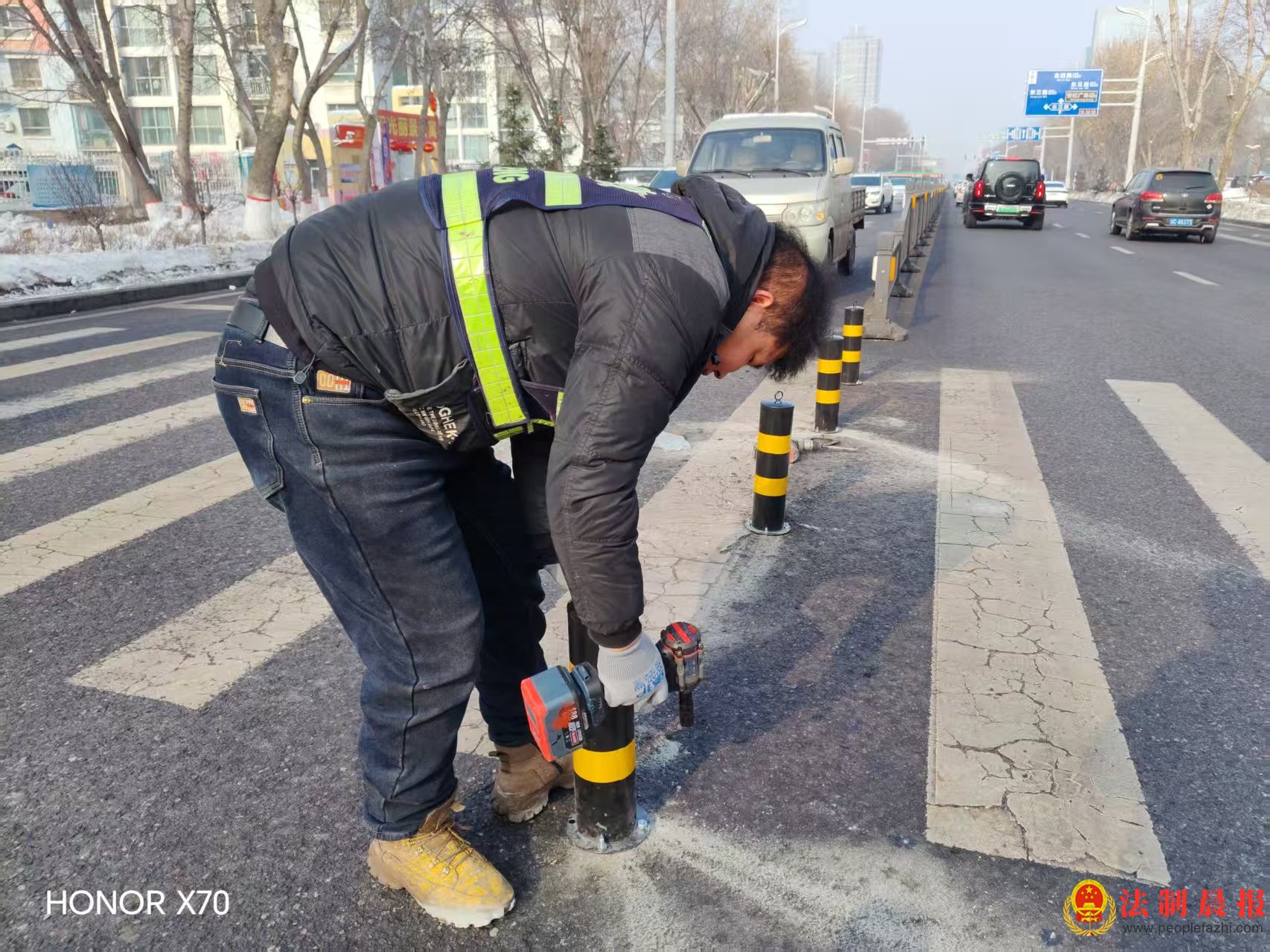 2月4日,在石河子市东四路(北二路至北三路段)机动车道上,石河子市城管局市政工程养护中心的交通设施维护人员,正有序地在斑马线处安装阻车桩。在保障行人过街安全的同时,也进一步规范了道路交通秩序。