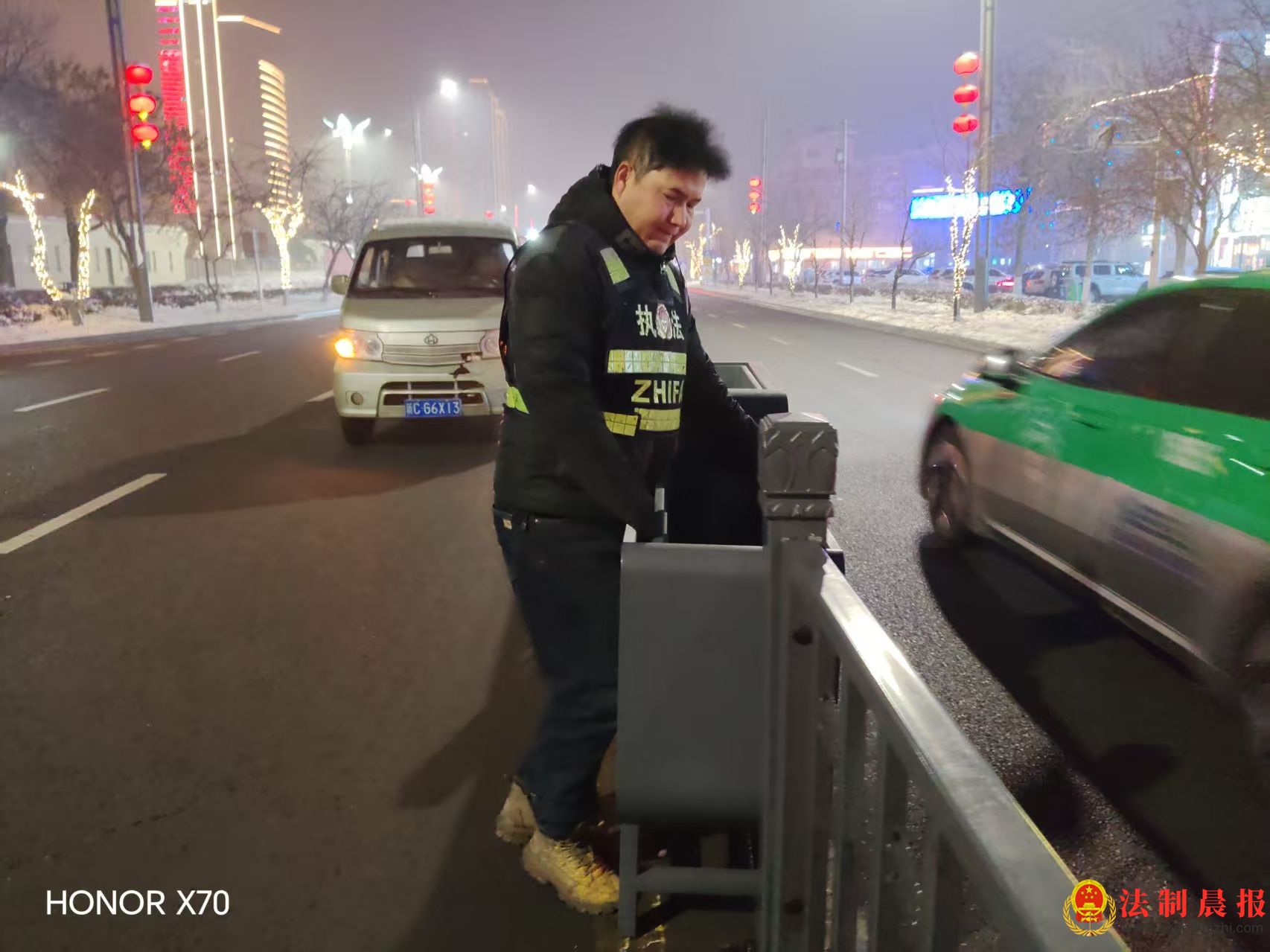 1月27日深夜23时17分,当城市逐渐进入梦乡,石河子市北四路(东四路至东五路段)上,几盏闪烁的警示灯格外醒目。石河子市城管局市政工程养护中心的交通设施维护人员们,正顶着凛冽寒风,对沿线出现歪斜、损坏的交通护栏与花箱式护栏进行紧急校正与修复。
