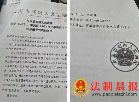 2025年7月17日,河南省高级人民法院以《关于(2021)豫民终1163号民事判决书中利息损失性质的回函》形式复函南阳市宛城区税务局。