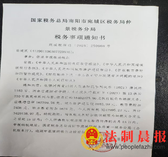 2025年9月8日,南阳宛城区税务局仲景税务分局再次下发了税务事项通知书(宛城税税通{2025}250908号)称:依据河南省高级人民法院民事判决书(2021)豫民终1163号、河南省南阳市中级人民法院执行裁定书(2023)豫13执异230号裁定书所列内容,你取得的“16402375.86元执行款”负有纳税义务,应缴增值税162399.76元、城市维护建设税5683.99元、教育费附加2436元、地方教育附加1624元、个人所得税3247995.22元,共计3420138.97元。