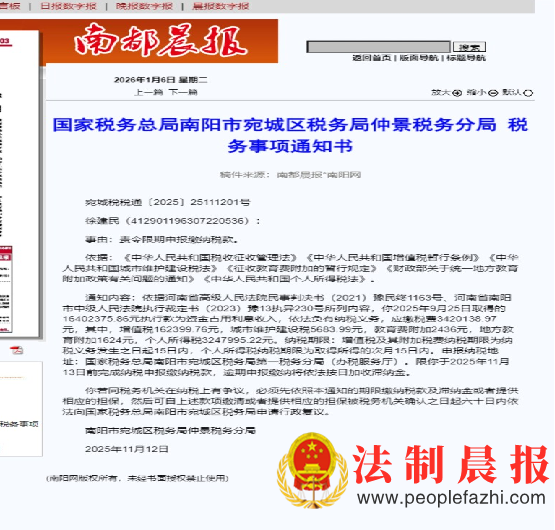 但是,2026年1月6日,南阳市宛城区税务局仲景税务分局在《南都晨报》上刊登了“宛城税税通[2025]25111201号”《税务事项通知书》,又“判定徐某“2025年9月25日取得的执行款为‘资金占用利息收入’,应缴税费340万元”。