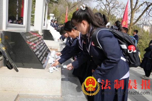 学生代表向烈士敬献花圈;校党总支书记陈联合、副校长白强整理花篮挽联;全体师生向先烈鞠躬,向革命先烈默哀。
