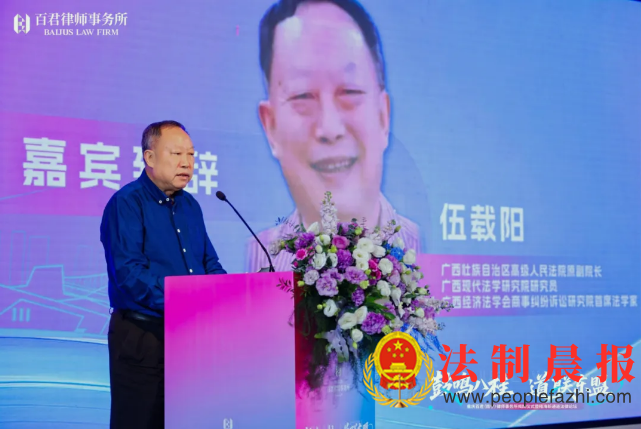广西壮族自治区高级人民法院原副院长、广西现代法学研究院研究员、广西经济法学会商事纠纷诉讼研究院首席法学家伍载阳在致辞中对百君南宁所的成立致以热烈祝贺。他指出,百君落户南宁,既是自身全国布局的关键一步,也为八桂大地的法治建设注入了新的活力。他期望百君紧扣广西面向东盟开放合作的战略定位,精准服务地方发展需求,为区域经济社会高质量发展提供有力法律支撑;同时发挥百君的平台优势,凝聚行业力量,共同提升广西法律服务的专业水平与影响力。