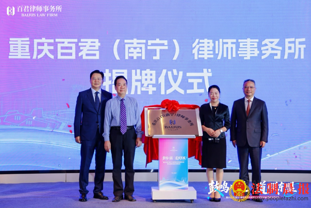 百君董事局主席孙渝、百君总所主任韦锋、百君南宁所主任王凤、百君南宁所律师林日华共同为重庆百君(南宁)律师事务所揭牌。红绸飘落间,象征着百君南宁所正式扬帆起航。