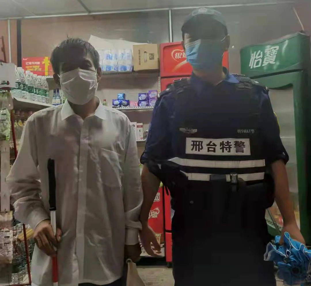 武装执勤民警巡逻中发现一名迷路的盲人,并将其安全送到目的地。