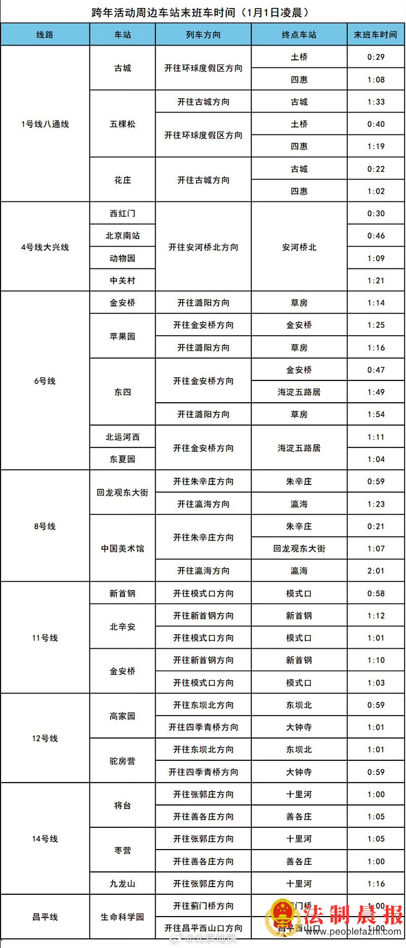 为做好枢纽地区轨道交通服务保障,满足旅客夜间出行需求,12月31日,地铁4号线北京南站上行方向末班车延时至次日0:46;1月3日地铁4号线北京南站上行方向末班车延时至次日0:00,地铁7号线北京西站上行(终点站为高楼金站)末班车同步延时至次日0:00,以进一步提升轨道交通与“八站两场”的接驳效率,缓解夜间集中返京客流的运输压力,保障市民旅客假日期间出行顺畅、返程无忧。